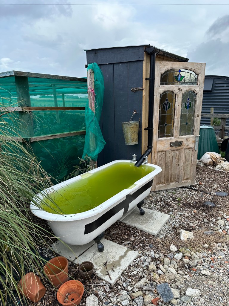 Finally we’ve been visiting friends old and new and taking advice on how to plan the walled garden and the new veg garden. Our new friend Barbara inspired us with her incredible vegetable garden and selection of sheds, greenhouses, poly tunnels, Shepherds’ huts and artists’ studios. In her seventies, she grows all her own veg, with enough to spare. We’ve been panicking a little about how we are going to manage our veg garden, but seeing how well she manages hers using no dig principles, we feel quite reassured. I’m not sure I want to take a dip in her outdoor bath, however.