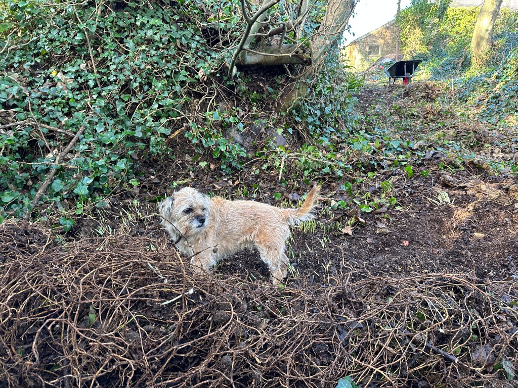 Unfortunately, I’m fairly sure none of these plants are snowdrops. My plant finder app isn’t too helpful without developed leaves or flowers to go on – but some of them look like them may be arum maculatum, AKA lords and ladies, which have lovely pale lily flowers in spring and intense clusters of very red berries in autumn. I shall keep an eye on the exposed areas over the next few weeks to see what emerges, and also to see whether the clumps which are still buried under ivy are able to emerge without any additional help from me.