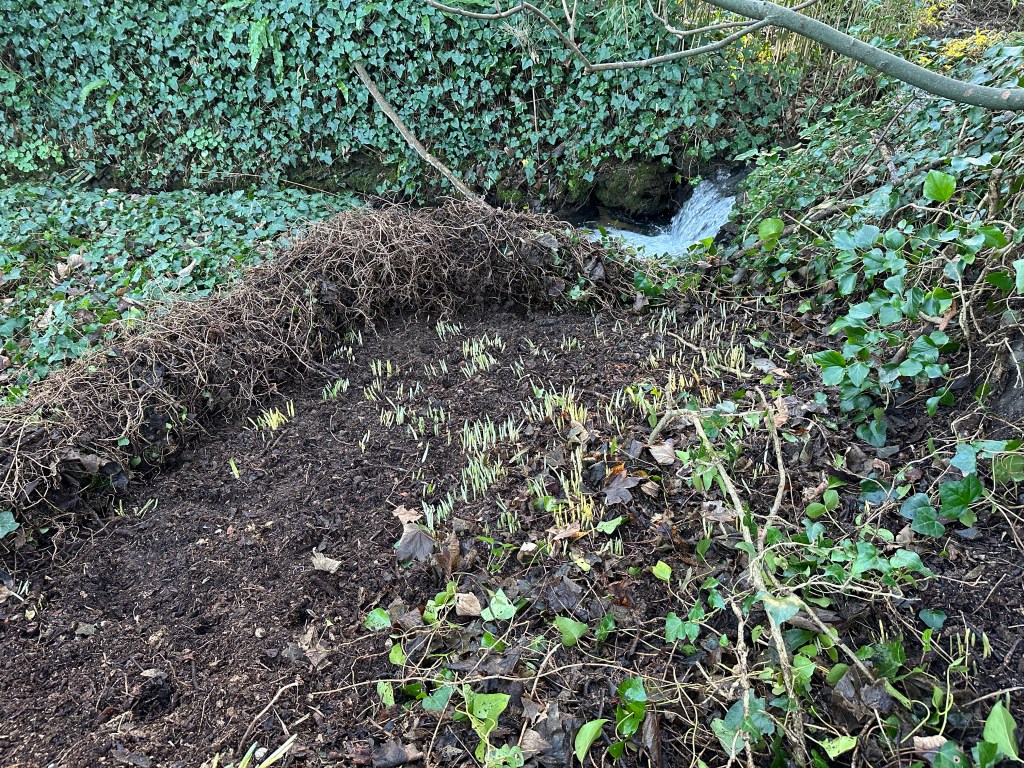 At first I wasn’t finding very much – the odd bulb or two – definitely not snowdrops. But as I excavated closer and closer to the stream, I started to find hundreds of small bulbs in clumps – with fresh green leaves poking up through the earth. They had been entirely concealed by the ivy. The more ivy I pulled back, the more I discovered. It was like finding buried treasure and I got a bit carried away. The earth is so soft down there that I could peel back the ivy like a roll of carpet!